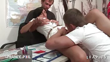Зрелая медсестра в белом спящие пьяные порно халате прыгает на больного падает